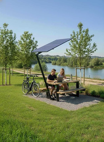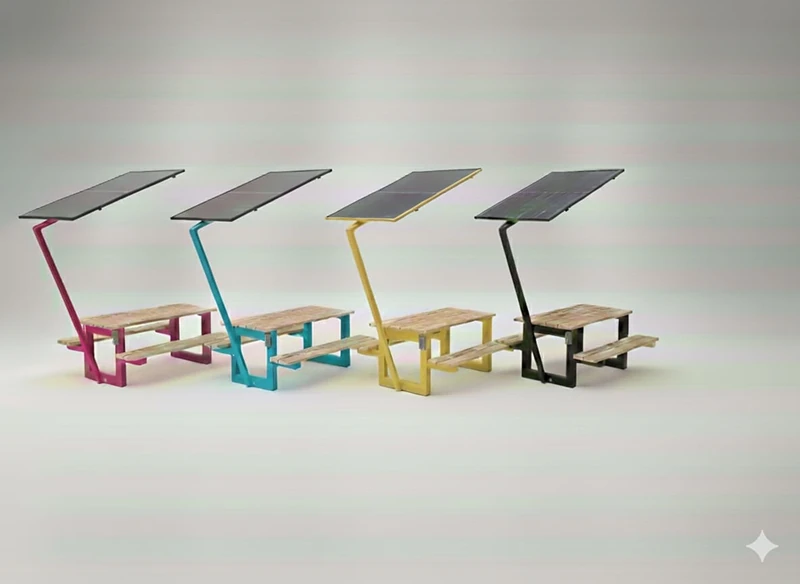 Table pique-nique contemporaine solaire et autonome capable de recharger les vélos électriques ainsi que les téléphones, tablettes…
